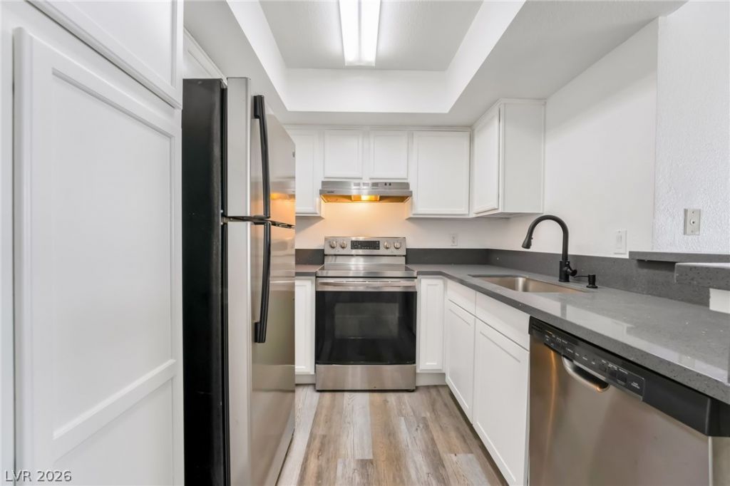 WOW!! Extensively renovated/remodeled 2-bedroom condo, perfectly situated just minutes from UNLV, Harry Reid International Airport, and the Las Vegas Strip. The open-concept living and dining areas feature new luxury vinyl flooring, while the cozy kitchen is equipped with high-end stainless-steel appliances and sleek granite countertops. The spacious bathroom offers a spa-like feel with dual sinks, and an in-unit washer and dryer add modern convenience. As an owner, you'll also enjoy access to a sparkling community pool, tennis courts, a perfect oasis for relaxing under the Las Vegas sun. Located directly across from Boulevard Mall for all your shopping and dining needs, this move-in-ready.