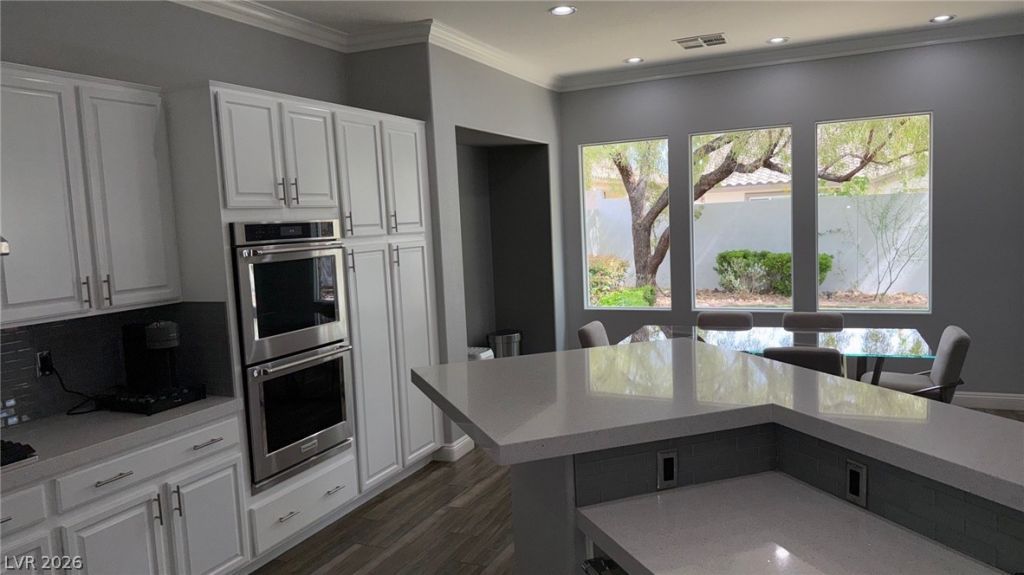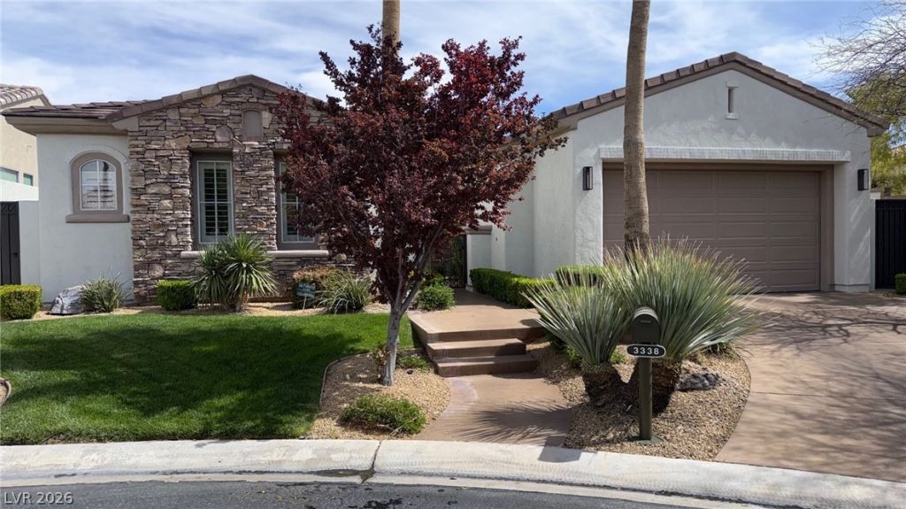 Beautifully remodeled single-story home located within the highly sought-after, prestigious guard-gated Red Rock Country Club. This thoughtfully designed floor plan offers a private primary suite separated from the secondary bedrooms, enhancing comfort and privacy. The light-filled interior features 11-foot ceilings and an open, inviting layout. The chef's kitchen is appointed with Silestone quartz countertops and KitchenAid stainless steel appliances. Situated on an elevated, private cul-de-sac premium lot with no neighbor to the right, this home offers exceptional privacy. The backyard showcases lush landscaping, putting-green, semi-in-ground spa designed for year-round enjoyment. Enjoy the convenience of walking distance to Goolsby Elementary and Dawson School via a private resident access gate. The home faces west?ideal for Las Vegas living in both winter and summer months. The property has been updated and upgraded throughout. A truly exceptional opportunity not to be missed.