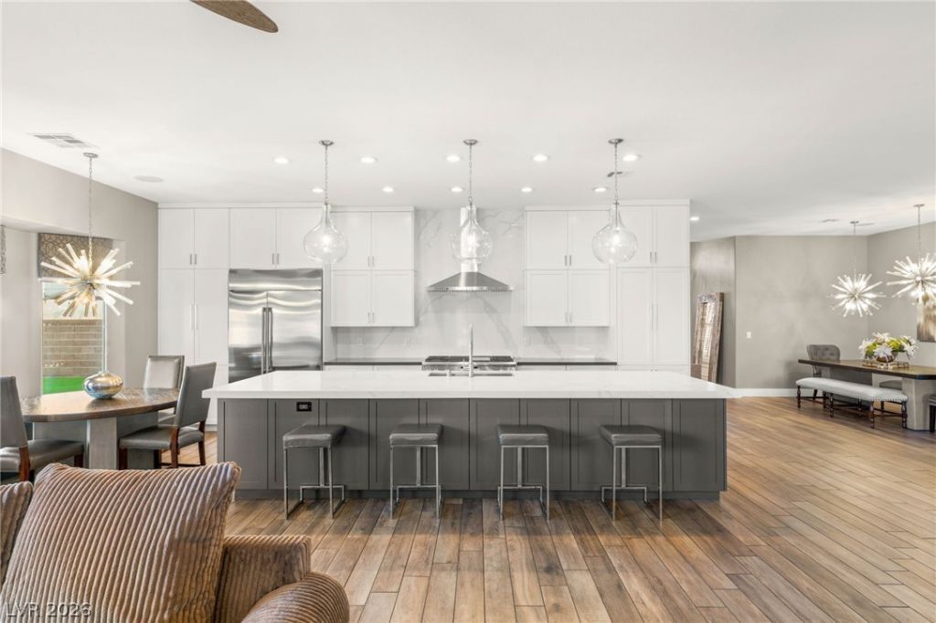 Tucked away on a quiet cul-de-sac in Lone Mountain, this beautifully updated home offers the perfect blend of modern design and resort-style living. SOLAR PAID FOR -$20 electric bill. The stunning chef's kitchen showcases custom two-tone cabinetry, custom Monogram stainless steel appliances, home gym an oversized island, and designer lighting, opening seamlessly to spacious living and dining areas with wide-plank flooring and abundant natural light. Step outside to a private backyard featuring a sparkling pool with waterfall, synthetic low maintenace grass, elevated lounging areas, & ambient string lighting ideal for entertaining. A rare full sport court adds versatility for basketball,or pickleball. Additional highlights include a striking entry with custom glass doors, stylish finishes throughout, and an ideal layout for both everyday living and gatherings. Conveniently located near shopping, dining, parks, and top-rated schools, this home offers privacy, & comfort